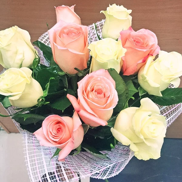 Роза белая (кремовая) и розовая 70 см - 11 шт , упаковка фетр.