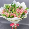 Букет состоит из альстромерии, которую еще называют перуанской лилией из-за внешнего сходства, разнообразное цветовое сочетание, в окружении декоративной зелени. Диаметр букета от 25см до 50см, в зависимости от выбранного варианты букета.  Букет перевязан изящным розовым бантом. Обращаем Ваше внимание, что состав и оформление букета может отличаться.